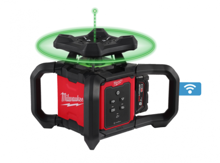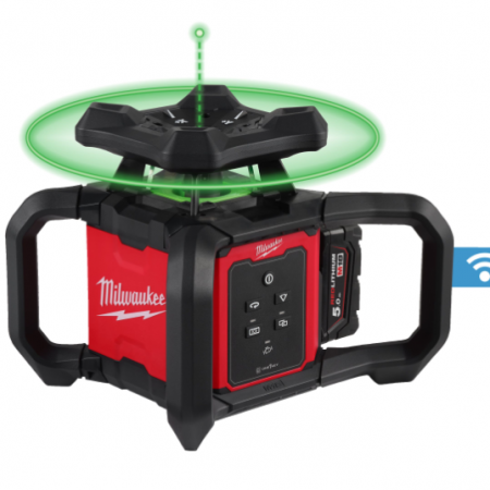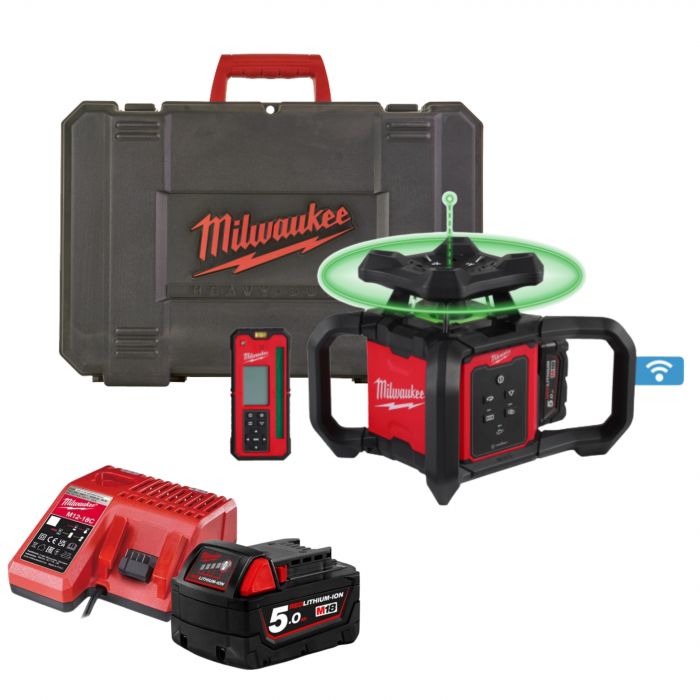 מאזנת לייזר מסתובבת נטענת 300 מ' אור ירוק נטענת 18V כולל סוללה 5AH + מטען כולל גלאי במזוודה Milwaukee M18™ ONE-KEY™ RLOHVG300-501C- מאזנת לייזר מסתובבת ירוקה עד 300 מ' מבית מילווקי ארה"ב