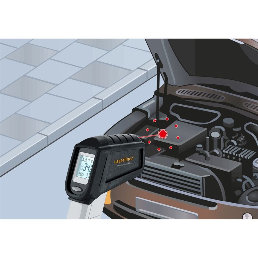 מד חום מקצועי אינפרא-אדום עם לייזר מובנה למדידה במקומות עם מגבלות גישה LaserLiner ThermoSpot Plus 082.042Aלמדידה ממרחק בטוח של מקורות פולטי חום