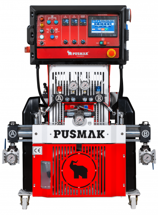 מכונה לריסוס פוליאוריה ופוליאוריטן קומפלט כולל גנרטור ומדחס בוכנתי KPX40 מבית PUSMAKמכונה הידראולית מקצועית לריסוס פוליאוריה חמה
