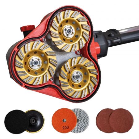 • מלטשת תעשייתית תלת-ראשית לבטון כולל מוט טלסקופי לליטוש קל