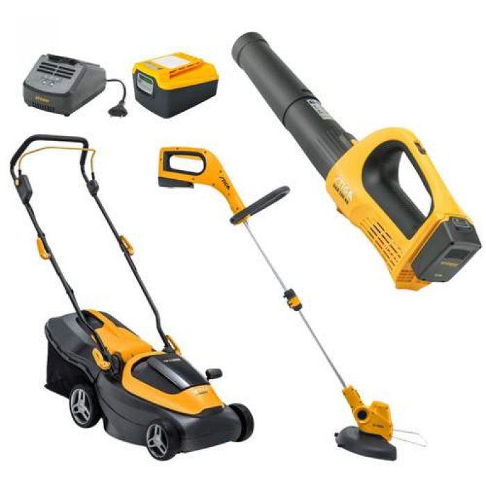 - סט מושלם לכל גינה מפוח עלים מכסחת דשא וחרמש נטענים 20V מבית STIGA