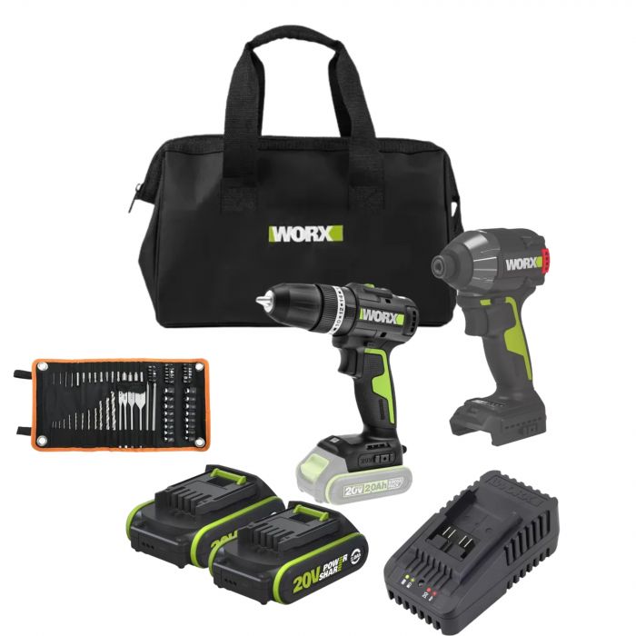 סט מברגות בראשלס 20V כולל זוג סוללות 2AH + מטען סט ביטים ומקדחים בתיק כלים WORX WU291 WE213