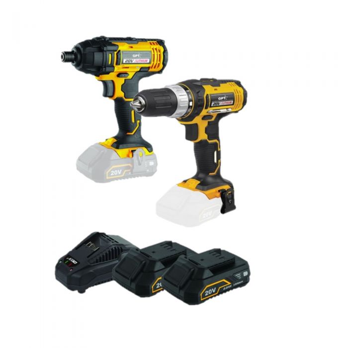 סט מברגות 20V מברגת אימפקט TOT006 + מברגה/ מקדחה TOT007 נטענת + 2 סוללות 2AH + מטען מהיר GPT TOT00672- סט מברגות איכותי מבית GPT