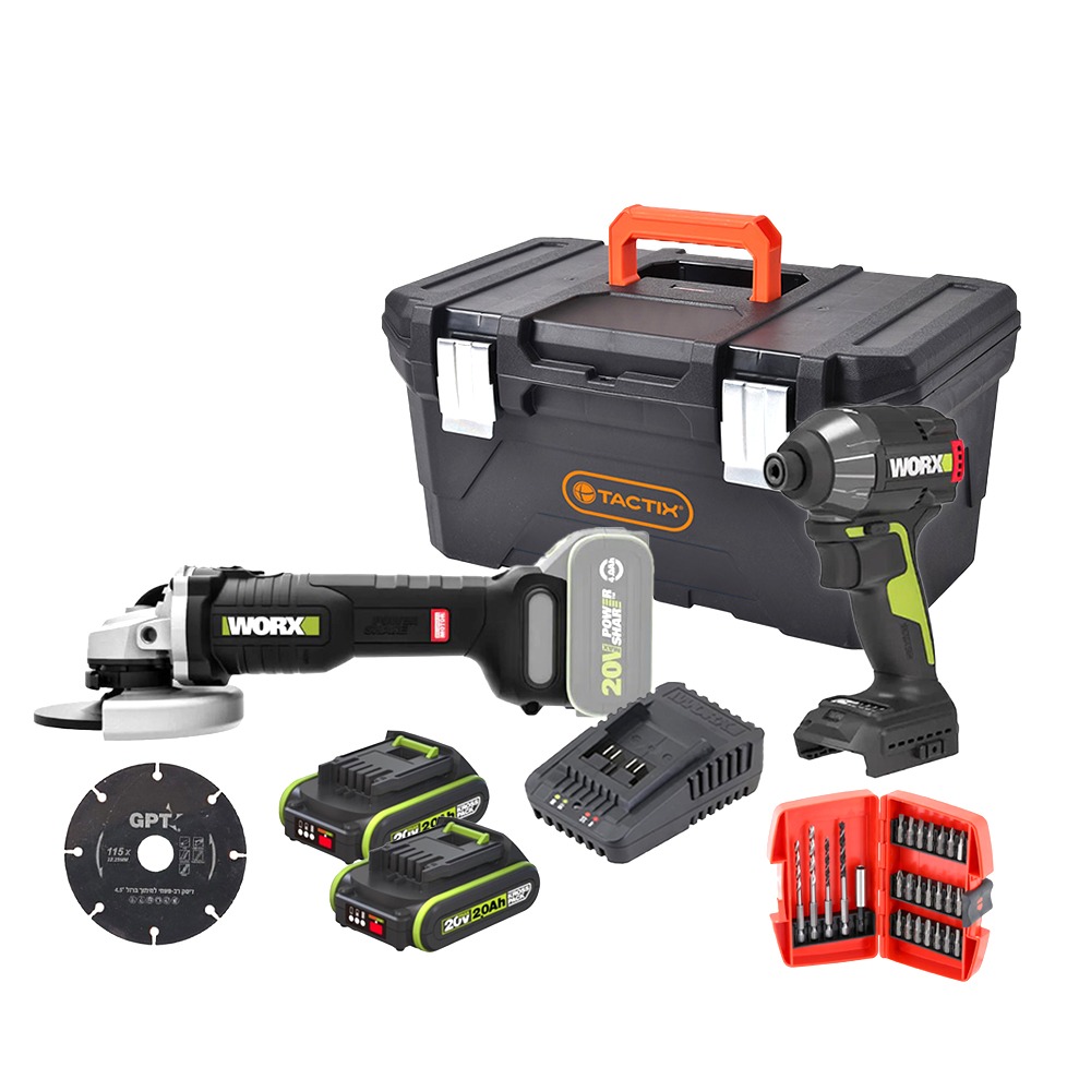 סט מברגות מברגת אימפקט WX291 20V + מברגת פוטר WX100 20V + סוללה 2A + מטען + ארגז WORX WX1291- סט מברגות 20V נטענות + סוללה ומטען