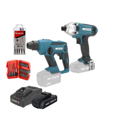 סט כלים 18V מברגת אימפקט ופטישון כולל סוללה 2AH מטען מהיר כולל סט אביזרים WESCO