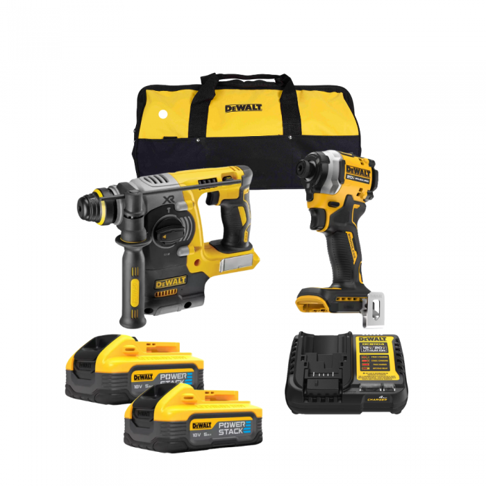 סט פטישון DCH273 ומברגה DCF850 כולל זוג סוללות 5AH POWERSTACK + מטען מהיר בתיק כלים DEWALT ATOMIC™ POWERSTACK- סט פטישון ומברגה בדגמים הנבחרים כולל סוללות POWERSTACK מבית DEWALT ארה"ב
