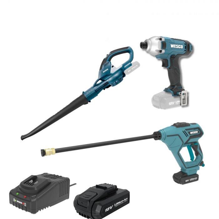 סט 3 כלים נטענים 18V מברגת אימפקט + מפוח עלים + מכשיר שטיפה + סוללה 2AH + מטען מהיר WESCO