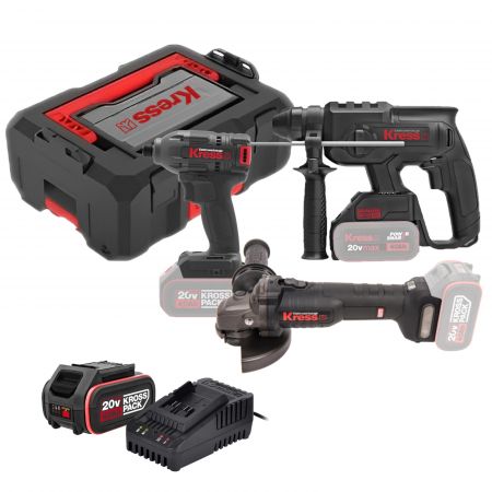 סט 3 כלים 20V פטישון KU390 + מברגת אימפקט KU290 + משחזת זווית KU801 נטענת + סוללה 4AH + מטען במזוודה KRESS