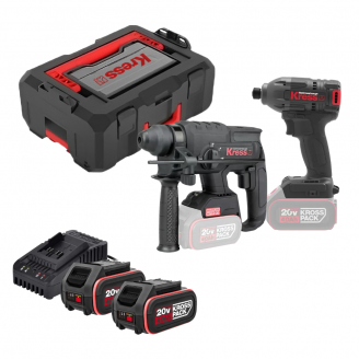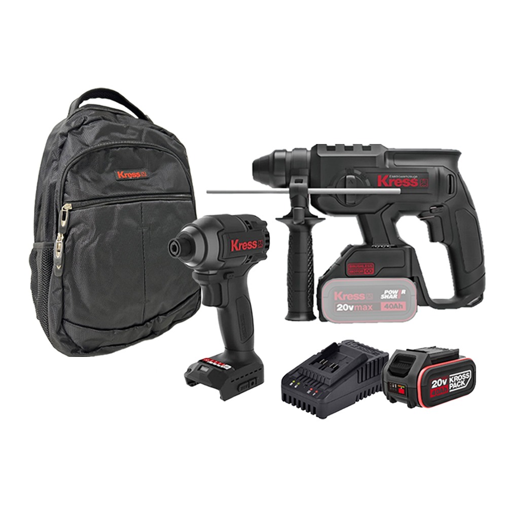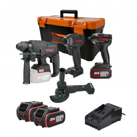 סט 4 כלים 20V מברגת אימפקט KU280+ פטישון 22 מ"מ KU390 + משחזת זווית "5 KU801 + מפתח רטיטה KU272 נטען+ 2 סוללות 4A + מטען בארגז כלים KRESS