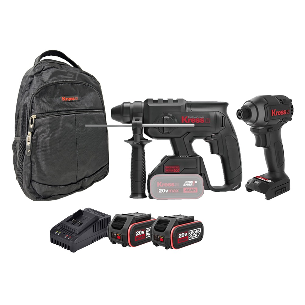 סט 4 כלים 20V מברגת אימפקט KU280+ פטישון 22 מ"מ KU390 + משחזת זווית "5 KU801 + מפתח רטיטה KU272 נטען+ 2 סוללות 4A + מטען בארגז כלים KRESS- סט 4 כלים בראשלס 20V מבית KRESS גרמניה