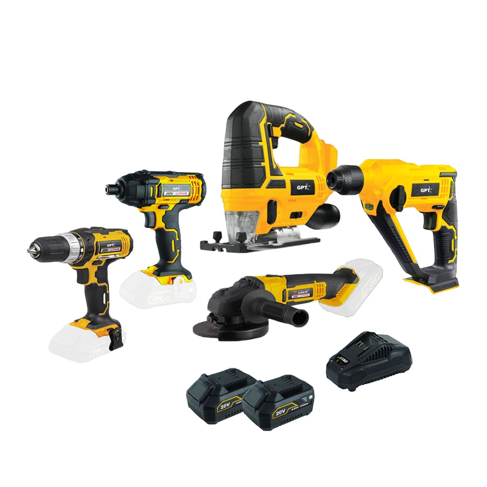 סט 5 כלים נטענים 20V פטישון + משחזת + מסור אנכי + מברגת אימפקט + מברגה/מקדחה + 2 סוללות 4.0Ah + מטען GPT G-SET05- סט 5 כלים מושלם מבית GPT