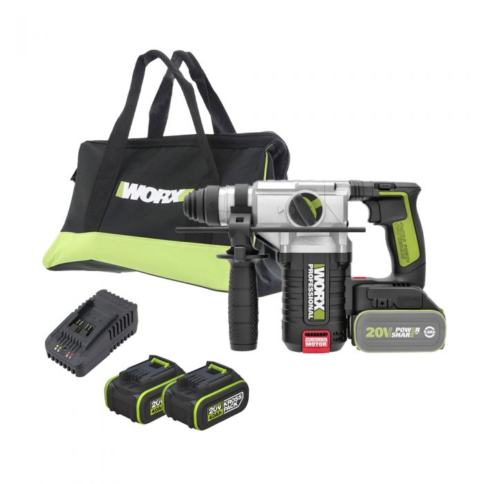 פטישון 24 מ"מ נטען 20V BL + שתי סוללות 4AH ומטען WORX WU388.9- מתח 20V.
