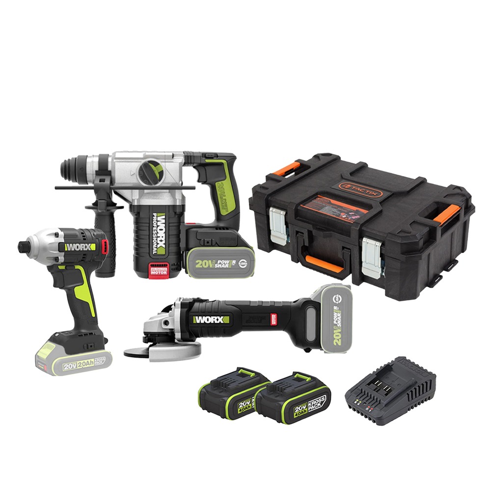 סט 3 כלים מברגת אימפקט WU290 + פטישון 24 מ"מ WU388 + משחזת זווית WU809 נטענת + 3 סוללות 4A/2A + מטען + ארגז טכנאיםTACTIX מקצועי WORX H/TO225 ₪2,999 ₪2,099